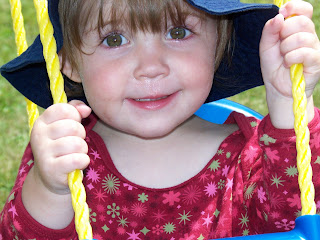 I just happened to luck out and get this picture of my dd, she was swinging in the little kids swing and she was on the return swing towards me. I didn't think that I got the picture I wanted, but I was happily surprised about what I did get :)! She is wearing her brothers sun hat, since he kept dropping it...my Aunt put it on her to keep the sun off of her for a bit. The funny thing is that she would keep this hat on, but not her cute little pink sun hat on that she did have on earlier....